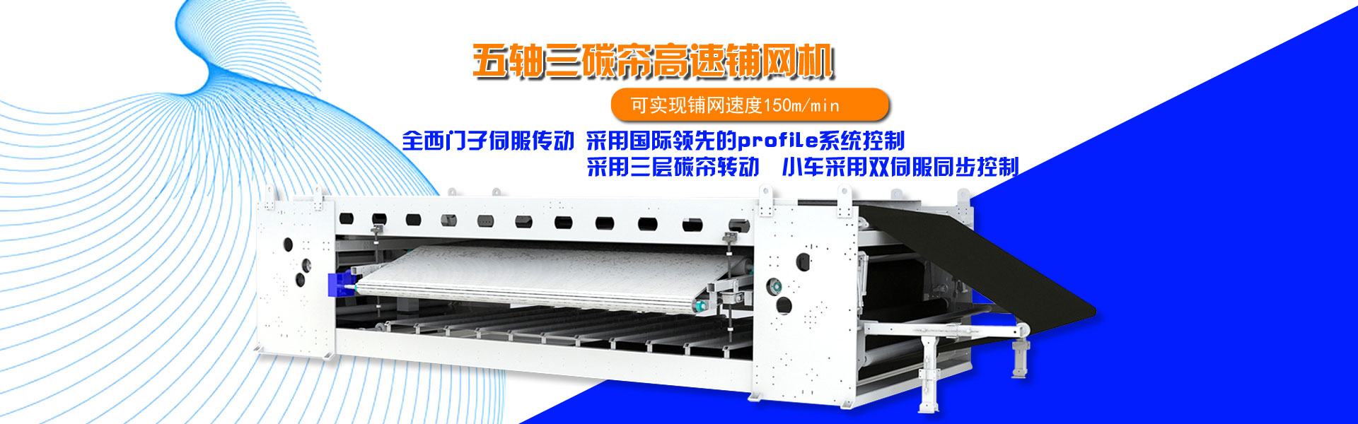 現公司主要供應設備:開包機、開松機、混棉機、給棉機、梳理機、鋪網機、氣流成網機、牽伸機、針刺機、起絨機、提花機、水刺機、熱熔烘箱、噴膠紡絲棉烘箱、收卷機……其中針刺機最寬11m,梳理機最寬3.5m,鋪網機速度130m/min;